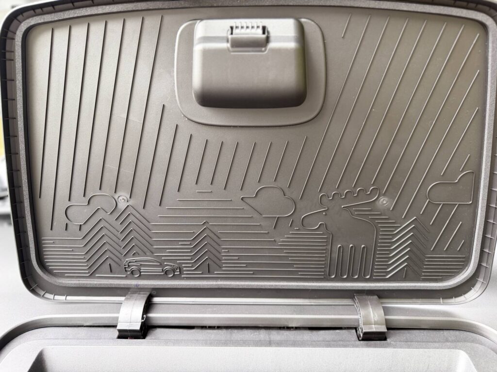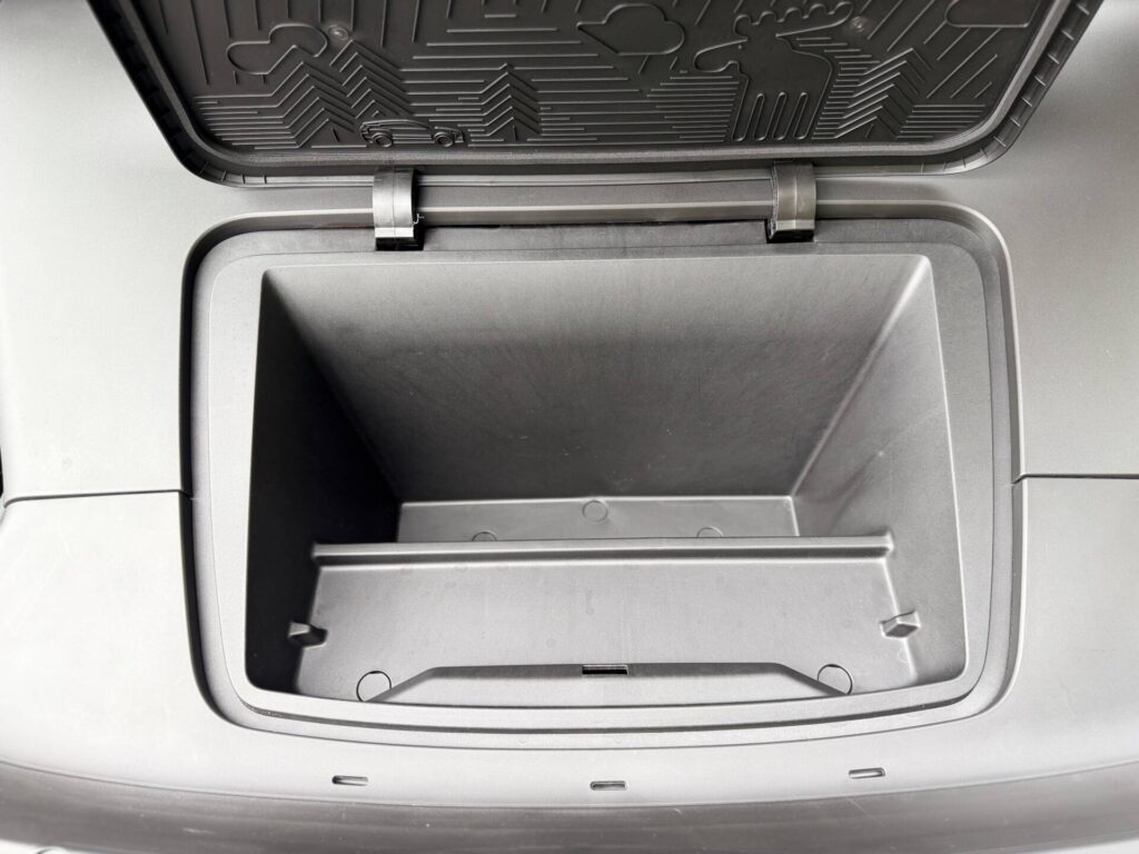 There’s also a small front boot with a Cross Country-specific impression on the underside of the lid. You can fit the charge cables in there or under the boot floor when it’s in its highest position. I’d go with the front boot because the cables won’t slide around. Or go bonk against the tailgate when you floor it.